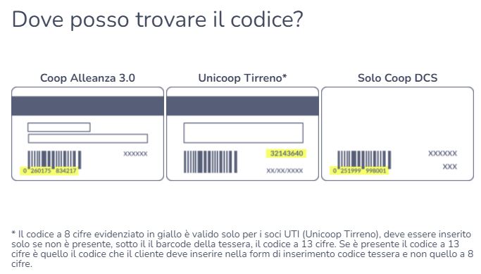 Se il sistema non riconosce la tua carta socio Coop, assicurati di inserire correttamente il numero della tessera. Per i soci di Coop Alleanza 3.0, il numero della tessera è un codice di 13 cifre che si trova sotto il codice a barre sul retro della carta.